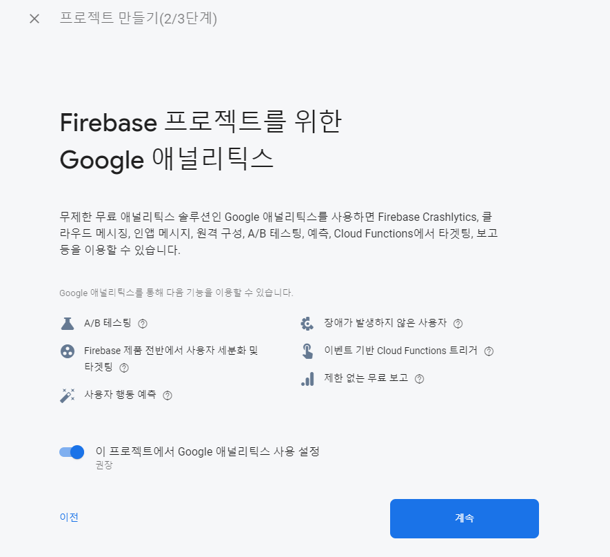 1. 파이어베이스에 로그인하여 프로젝트를 생성합니다.