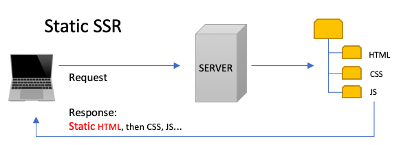 서버 사이드 랜더링은 말 그대로 어떠한 요청 시마다 서버(프론트엔드가 돌아가고있는 환경)에서 자원을 가져와 랜더링을 해주는 것입니다.